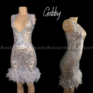 This sexy after 5 dress is perfect for a night on the town or a luxurious after party. The Gabby dress features ostrich feather hemline trimming and a plunging v-neckline for ample cleavage.